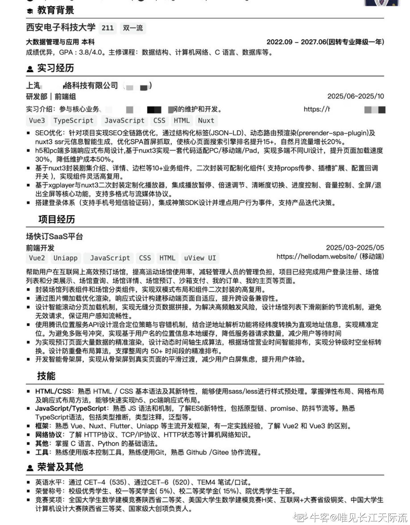 [!note]+ 简历一 |400 |400 ∂ [!note]+ 简历二 亮点: 数据埋点 SEO 优化
